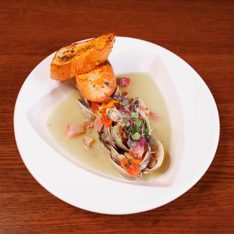 Clams sautéed in white wine with caramelized pancetta. Served with toasted garlic parmesan bread