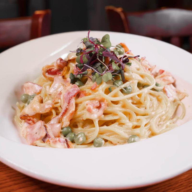 Spaghetti with bacon, onions & peas in an egg cream sauce