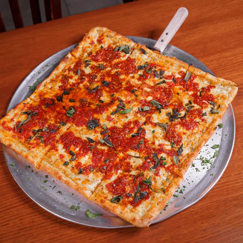 Italian square style pizza with whole milk mozzarella and our signature grandmas sauce with fresh garlic