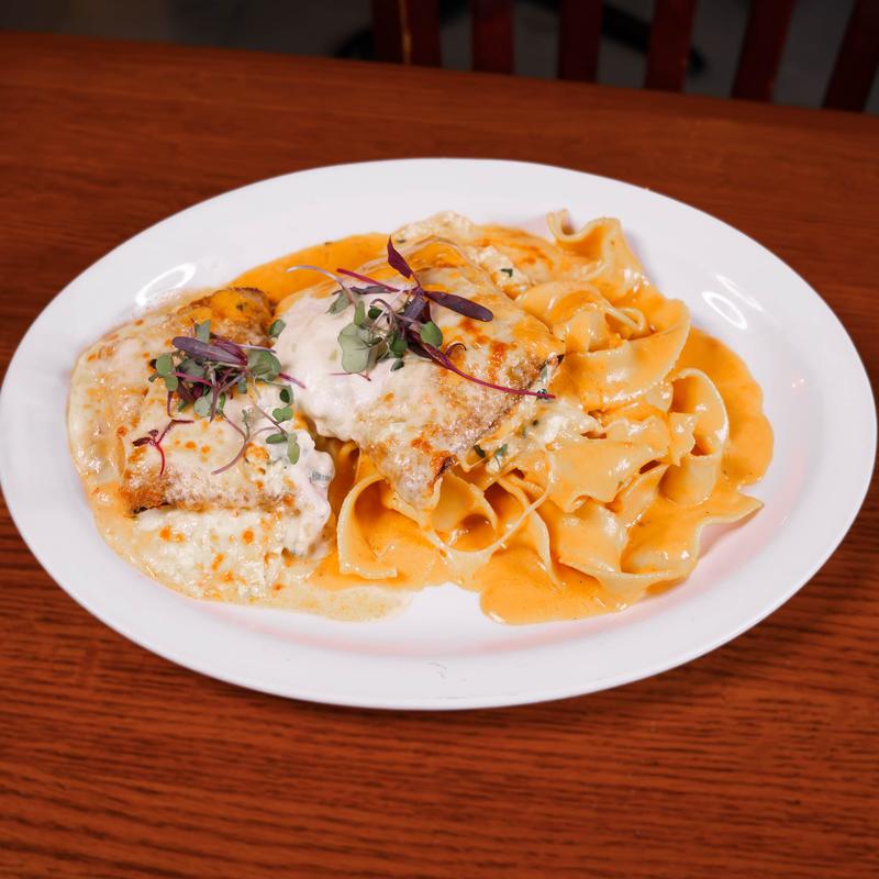 A perfectly seasoned breaded chicken breast with melted mozzarella cheese and smothered in a creamy vodka sauce, served with a side of fresh homemade tagliatelle